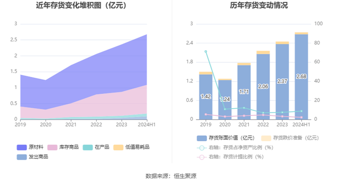 从存货变动来看,截至2024年上半年末,公司存货账面价值为2.68亿元,占净资产的8.83%,较上年末增加3109.28万元。其中,存货跌价准备为628.16万元,计提比例为2.29%。
