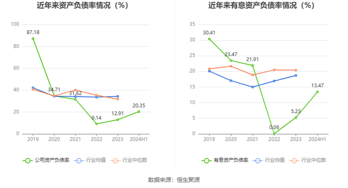 在偿债能力方面,公司2024年上半年末资产负债率为20.35%,相比上年末上升7.44个百分点;有息资产负债率为13.47%,相比上年末上升8.24个百分点。