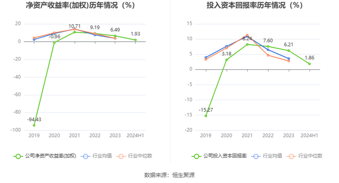数据显示,2024年上半年公司加权平均净资产收益率为1.93%,较上年同期下降0.85个百分点;公司2024年上半年投入资本回报率为1.86%,较上年同期下降0.89个百分点。
