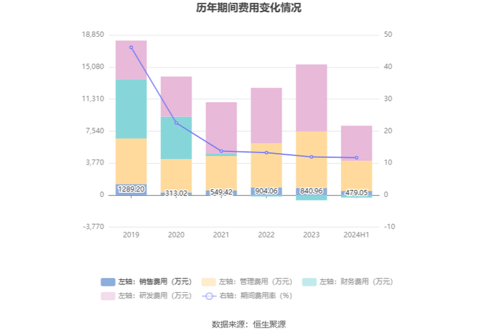 2024年上半年,公司期间费用为7883.15万元,较上年同期增加1864.58万元;期间费用率为11.70%,较上年同期上升0.90个百分点。其中,销售费用同比增长35.44%,管理费用同比增长38.25%,研发费用同比增长10.39%,财务费用由去年同期的-650.90万元变为-286.46万元。