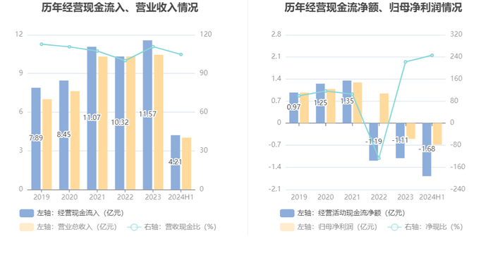 进一步统计发现,2024年上半年公司自由现金流为-2.12亿元,上年同期为-2.14亿元。