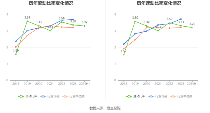 2024年上半年,公司流动比率为3.32,速动比率为3.22。