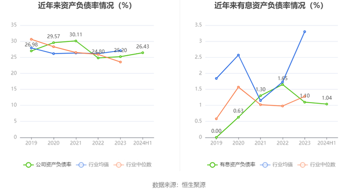 在偿债能力方面,公司2024年上半年末资产负债率为26.43%,相比上年末上升1.23个百分点;有息资产负债率为1.04%,相比上年末下降0.06个百分点。