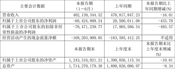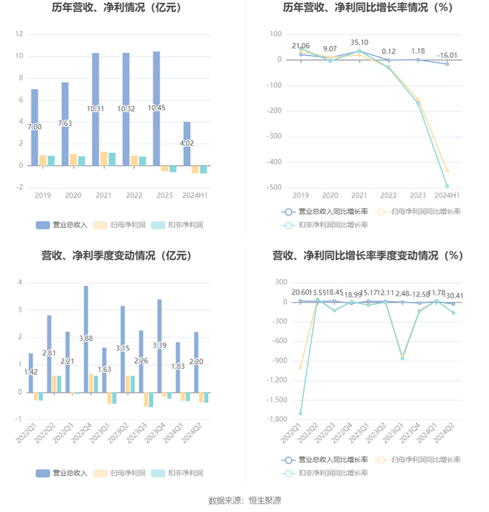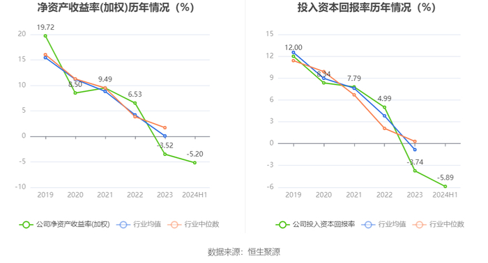 数据显示,2024年上半年公司加权平均净资产收益率为-5.20%,较上年同期下降6.60个百分点;公司2024年上半年投入资本回报率为-5.89%,较上年同期下降6.65个百分点。