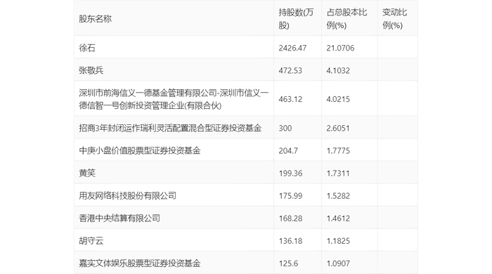 半年报显示,2024年上半年末公司十大流通股东中,新进股东为招商3年封闭运作瑞利灵活配置混合型证券投资基金、黄笑、香港中央结算有限公司、胡守云、嘉实文体娱乐股票型证券投资基金,取代了一季度末的中欧养老产业混合型证券投资基金、万家自主创新混合型证券投资基金、中欧睿见混合型证券投资基金、中欧睿泽混合型证券投资基金、万家科技创新混合型证券投资基金。在具体持股比例上,张敬兵持股有所上升。