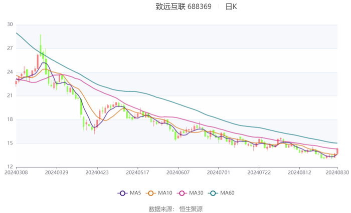 以8月30日收盘价计算,致远互联目前市盈率(TTM)约为-11.88倍,市净率(LF)约为1.33倍,市销率(TTM)约为1.7倍。