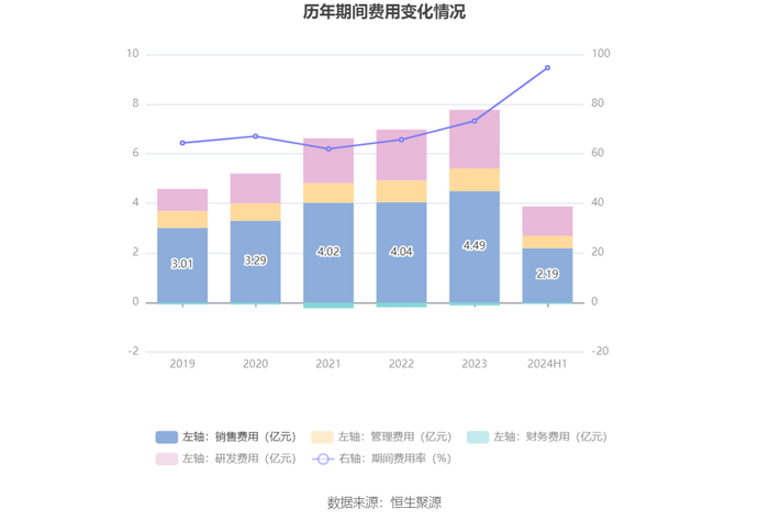 2024年上半年,公司期间费用为3.81亿元,较上年同期增加1244.98万元;期间费用率为94.63%,较上年同期上升17.76个百分点。其中,销售费用同比增长1.9%,管理费用同比增长15.25%,研发费用同比增长0.23%,财务费用由去年同期的-769.82万元变为-622.57万元。
