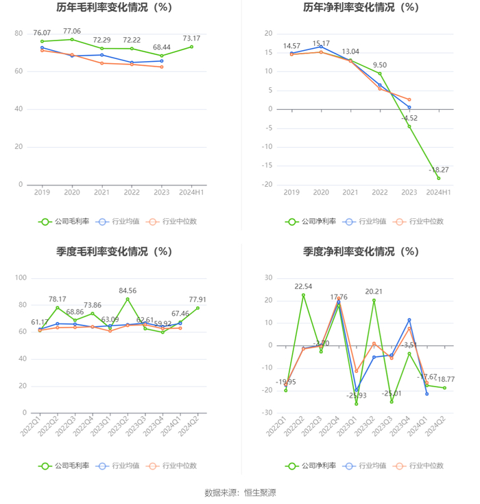2024年上半年,公司毛利率为73.17%,同比下降4.06个百分点;净利率为-18.27%,较上年同期下降22.74个百分点。从单季度指标来看,2024年第二季度公司毛利率为77.91%,同比下降6.65个百分点,环比上升10.45个百分点;净利率为-18.77%,较上年同期下降38.98个百分点,较上一季度下降1.10个百分点。