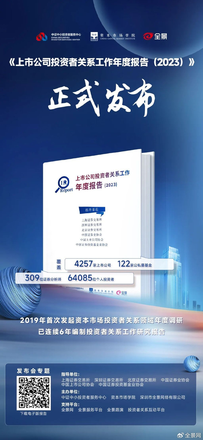 2019年,全景在各监管单位的支持下首次发起了资本市场上市公司投资者关系工作调研,并编制发布2018年度《上市公司投资者关系工作年度报告》。今年全景继续携手中证中小投资者服务中心、资本市场学院,发起了2023年度上市公司投资者关系工作专项调研,并编制《上市公司投资者关系工作年度报告》,目前全景已连续六年参与编制和发布此报告,今天正式迎来了2023年度《上市公司投资者关系工作年度报告》的发布。