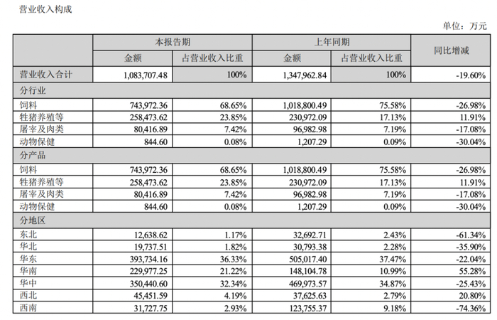 饲料方面,报告期内,公司实现饲料内外销量 288.74 万吨,同比下降 9.49%。