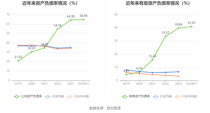 在偿债能力方面,公司2024年上半年末资产负债率为64.95%,相比上年末上升0.57个百分点;有息资产负债率为41.07%,相比上年末上升1.23个百分点。