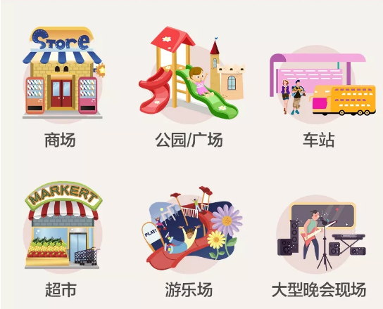 据统计,以下6大场所,儿童容易走失:商场、公园或广场、车站、超市、游乐场、大型晚会现场。