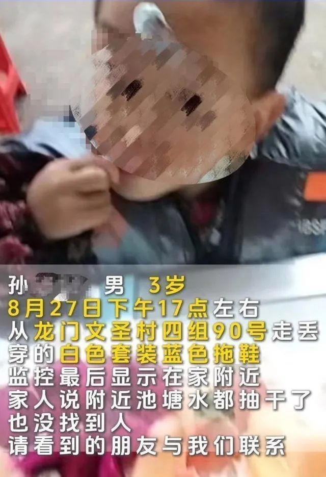 寻人启事显示,孙某某,男,3岁,8月27日17点左右,从龙门镇文圣村走丢,穿的白色套装、蓝色拖鞋。监控显示最后出现在家附近。家人称附近池塘水都抽干了,也没有找到人。并附上了孙某某的照片。