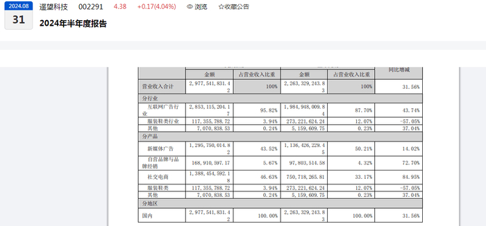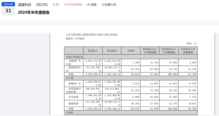 从毛利率变化来看,报告期内,互联网广告行业、服装鞋类行业的毛利率分别录得:7.38%、40.35%,同比均明显增长。从互联网广告细分产品来看,新媒体广告、自营品牌与品牌经销、社交电商的毛利率分别录得:2.51%、23.32%、9.99%,其中,营收占比40%以上、营收贡献第二的新媒体广告,其毛利率同比减少0.76%。