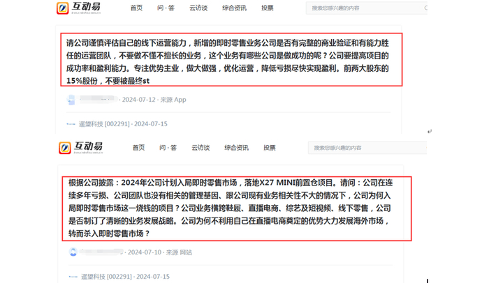 另有投资者也对即时零售提出质疑:请公司谨慎评估自己的线下运营能力,新增的即时零售业务公司是否有完整的商业验证和有能力胜任的运营团队,不要做不懂不擅长的业务,这个业务有哪些公司是做成功的呢?公司要提高项目的成功率和盈利能力。专注优势主业,做大做强,优化运营,降低亏损尽快实现盈利。前两大股东的15%股份,不要被最终st。