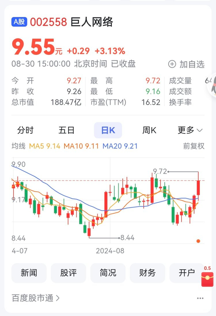 同时,巨人网络披露了2024半年度利润分配预案,拟向全体股东每10股派发现金红利1.40元(含税),现金分红金额2.65亿元。