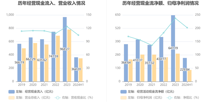 2024年上半年,公司营业收入现金比为104.63%,净现比为202.28%。