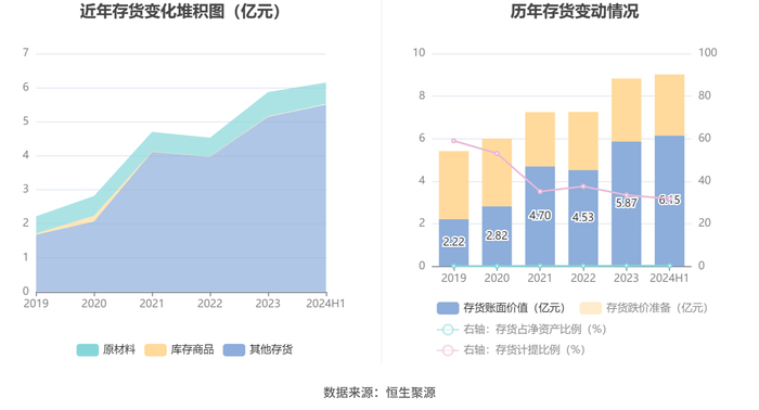 从存货变动来看,截至2024年上半年末,公司存货账面价值为6.15亿元,占净资产的0.32%,较上年末增加2824.83万元。其中,存货跌价准备为2.87亿元,计提比例为31.79%。
