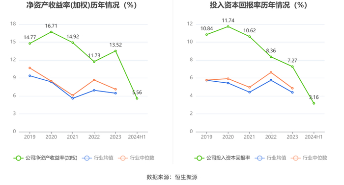 数据显示,2024年上半年公司加权平均净资产收益率为5.56%,较上年同期增长1.28个百分点;公司2024年上半年投入资本回报率为3.16%,较上年同期增长0.42个百分点。