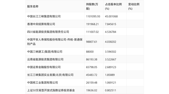 半年报显示,2024年上半年末公司十大流通股东中,持股最多的为中国长江三峡集团有限公司,占比45.00%。十大流通股东名单相比2024年一季报维持不变。在具体持股比例上,香港中央结算有限公司、四川省能源投资集团有限责任公司、上证50交易型开放式指数证券投资基金持股有所上升,中国长江三峡集团有限公司、云南省能源投资集团有限公司持股有所下降。