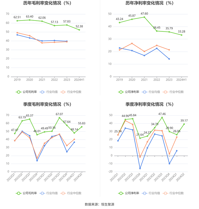 2024年上半年,公司毛利率为52.38%,同比上升2.45个百分点;净利率为33.28%,较上年同期上升3.76个百分点。从单季度指标来看,2024年第二季度公司毛利率为55.83%,同比上升5.47个百分点,环比上升7.69个百分点;净利率为39.17%,较上年同期上升4.47个百分点,较上一季度上升13.11个百分点。