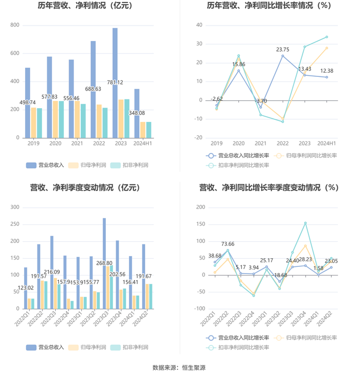 根据半年报,公司第二季度实现营业总收入191.67亿元,同比增长23.05%,环比增长22.55%;归母净利润73.95亿元,同比增长40.35%,环比增长86.43%;扣非净利润73.91亿元,同比增长50.04%,环比增长85.73%。