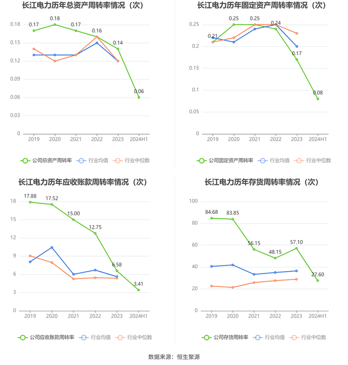 营运能力方面,2024年上半年,公司总资产周转率为0.06次,上年同期为0.05次(2023年上半年行业平均值为0.05次,公司位居同行业5/11);固定资产周转率为0.08次,上年同期为0.07次(2023年上半年行业平均值为0.09次,公司位居同行业8/11);公司应收账款周转率、存货周转率分别为3.41次、27.60次。