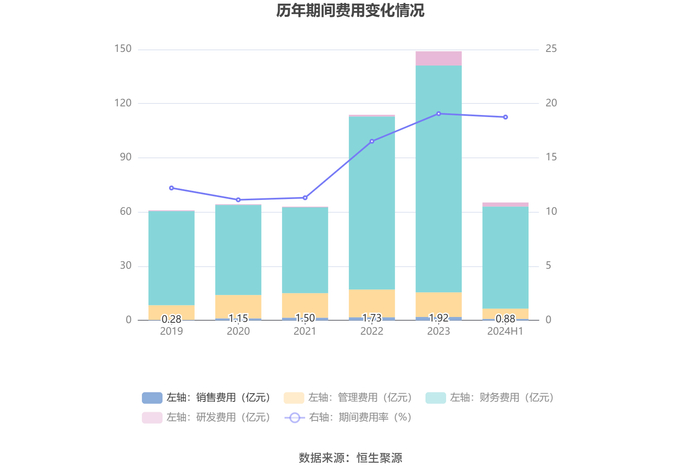 2024年上半年,公司期间费用为65.30亿元,较上年同期减少4.80亿元;期间费用率为18.76%,较上年同期下降3.87个百分点。其中,销售费用同比增长10.1%,管理费用同比增长10.64%,研发费用同比增长76.99%,财务费用同比下降10.19%。