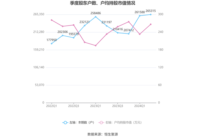 筹码集中度方面,截至2024年上半年末,公司股东总户数为26.53万户,较一季度末增长了3727户,增幅1.42%;户均持股市值由一季度末的233.19万元上升至266.71万元,增幅为14.37%。