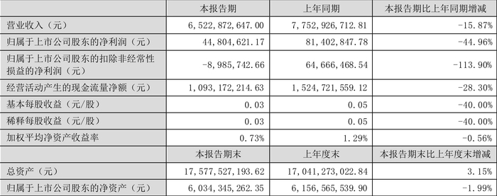 根据半年报,公司第二季度实现营业总收入25.99亿元,同比下降19.29%,环比下降33.77%;归母净利润3131.01万元,同比增长6.39%,环比增长132.02%;扣非净利润-1834.3万元,同比下降223.72%,环比下降296.03%。