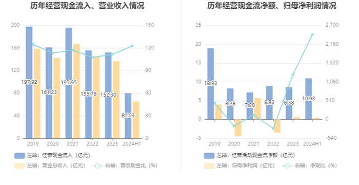 2024年上半年,公司营业收入现金比为122.69%,净现比为2439.86%。