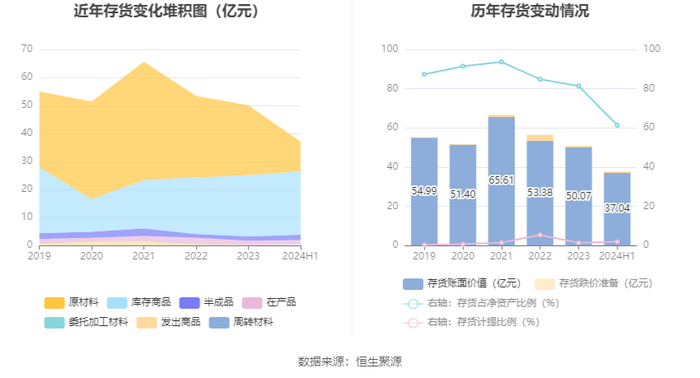 从存货变动来看,截至2024年上半年末,公司存货账面价值为37.04亿元,占净资产的61.38%,较上年末减少13.04亿元。其中,存货跌价准备为7494.68万元,计提比例为1.98%。
