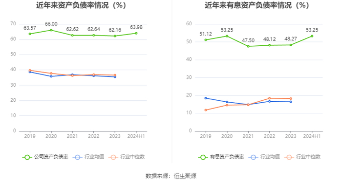 在偿债能力方面,公司2024年上半年末资产负债率为63.98%,相比上年末上升1.82个百分点;有息资产负债率为53.25%,相比上年末上升4.98个百分点。