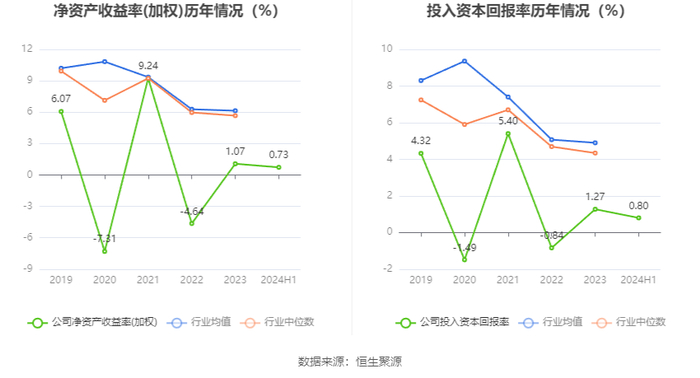 数据显示,2024年上半年公司加权平均净资产收益率为0.73%,较上年同期下降0.56个百分点;公司2024年上半年投入资本回报率为0.80%,较上年同期下降0.30个百分点。