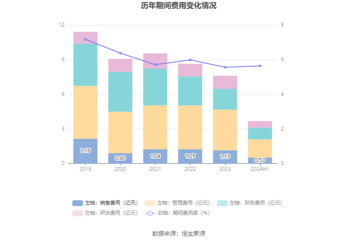 2024年上半年,公司期间费用为3.68亿元,较上年同期增加1307.17万元;期间费用率为5.65%,较上年同期上升1.07个百分点。其中,销售费用同比下降24.26%,管理费用同比下降13.58%,研发费用同比增长2.36%,财务费用同比增长109.72%。