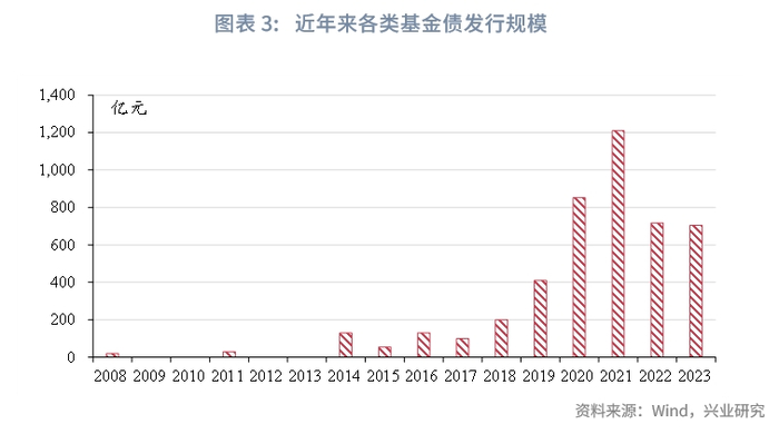 此前在2017年7月,在证监会发布的《关于开展创新创业公司债券试点的指导意见》中,就指出创业投资公司(向创新创业企业进行股权投资的公司制创业投资基金和创业投资基金管理机),可以发行创新创业公司债投资种子期、初创期、成长期的创新创业公司的股权。随后2019年9月,交易商协会也发布《双创专项债务融资工具信息披露表》指出:“双创专项债务融资工具是指非金融企业在银行间市场发行的,募集资金通过投债联动的模式用于支持科技创新企业发展的债务融资工具。……双创专项债务融资工具可用于基金出资,但应投资于政府出资产业投资基金或按照《创业投资企业管理暂行办法》备案的创业投资基金,且与所投基金总规模保持合理比例,不超过所投基金中发行人已认缴规模的60%。” 包括创新创业公司债券、双创债务融资工具在内的,可以将发债募集资金转化为创业投资基金股权投资资金的债券一般被称为“基金债”。从2018年开始,基金债发行规模出现快速上升,年度发行量一度在2021年达到超过1200亿元的高峰。不过从2022年开始,基金债的发行规模出现下降,2022年和2023年的年度发行量都维持在700亿元左右。为了做好科技金融这篇大文章,监管部门近期高度关注和鼓励基金债的发展,以期拓宽创业投资基金的募资渠道,因此未来基金债的发行规模有望得到提升。