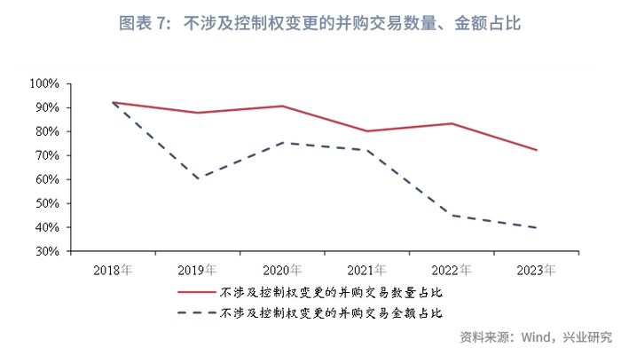 但在实际并购交易中大多数为不涉及控制权变更。根据WIND统计,境内外发生的并购交易中,超过70%的交易笔数均不涉及控制权的变更。在交易规模方面,2022年以前并购交易规模中超过70%也不涉及控制权的变更,但近两年随着股权投资市场的遇冷,过去一级市场的高估值和最近几年的估值“暴跌”,导致以参股为目的的并购交易规模锐减,而以控股为目的的并购交易规模相对稳定,从而使得控股型并购交易的金额占比有所上升。但总体而言,不涉及控股权的并购交易数量仍占到了所有并购交易数量的60%以上。