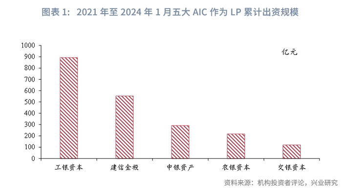 2020年2月28日至3月30日,原银保监会陆续批准五大金融资产投资公司(以下简称“AIC”)通过其附属机构在上海开展“不以债转股为目的”的股权投资业务,重点参与开展与上海自贸试验区临港新片区建设以及长三角经济结构调整、产业优化升级和协调发展相关的企业重组、股权投资、直接投资等业务。从试点情况来看,2021年至2024年1月末,五大AIC作为LP累计出资约2073亿元[2],其中工银AIC累计认缴出资高达900多亿元,平均每年投出150亿元[3],逐渐成为一级股权投资市场的重要出资人。
