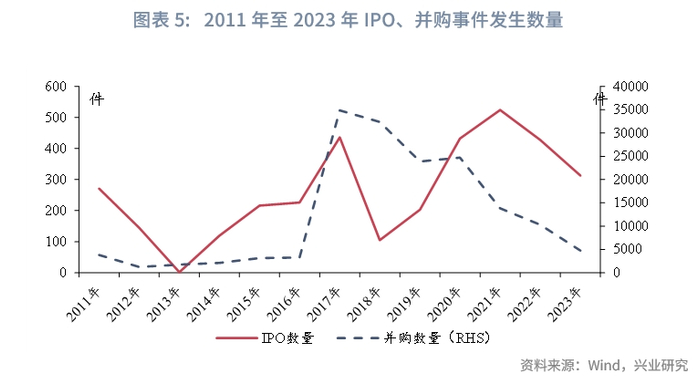 当前,我国较多产业投资基金有望于2025年前后集中到期,而传统退出渠道如上市、并购等事件发生数量有所下降,导致部分产业投资基金退出面临较大压力。以政府引导基金为例,2015年至2019年是我国政府引导基金发展的高峰期,年均设立规模约1万亿元,而考虑到此类基金的设定投资期限平均在7到10年,因此大规模的政府引导基金或将在2025年前后集中到期退出。近年来,由于多方面原因,资本市场IPO数量和规模已经连续两年出现下滑,而企业并购数量则自2017年以来就一直处于收缩的态势,退出渠道的不畅使得相当数量的政府引导基金面临较为严峻的退出难问题。而此次发布的《措施》中,也明确指出要:“系统研究解决政府出资的创业投资基金集中到期退出问题。”