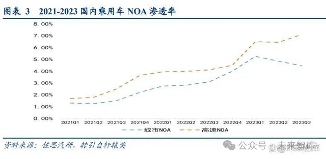 在各项利好加持下,我国智能驾驶渗透率快速提速。2023 年,乘用车 L2 级(自动驾驶) 渗透率达到 47.3%,2024 年 1 至 5 月突破 50%,部分功能接近 L3 级智能驾驶水平。国 内城市 NOA 技术(导航辅助驾驶)近年来蓬勃发展,成为智能驾驶领域的热点。根据盖 世汽车研究院预测,预计到 2025 年,国内搭载城市 NOA 功能的车辆数量将超过 300 万 辆。这一市场趋势被认为是智能驾驶技术发展的重要里程碑,提升了车辆的智能化水平, 为车企提供了新的竞争优势和数据训练方式。国内城市 NOA 技术正处于快速发展阶段, 多家车企积极投入,推动该技术的普及和应用。