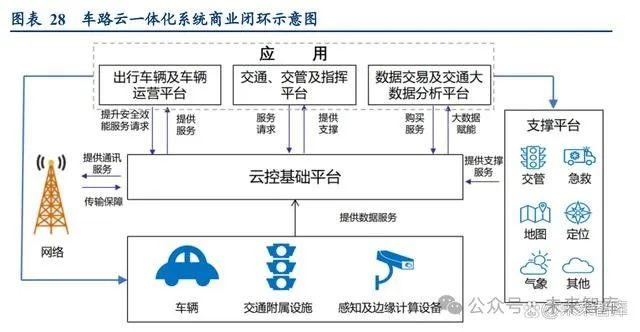 产业架构逐渐成熟,商业模式仍在探索阶段。目前,我国车路协同行业偏基础公共服务 模式,而非市场化模式。整个产业架构建设初期大概率仍由政府买单,成熟后可能会由 运营方承担,但商业模式仍在探索阶段。由政府制定相关政策,引导、吸引以长期投资 为目标的各类资本方成立特许运营主体,进行基础设施的投资、建设与运营模式创新, 并由云控基础平台采购其资源与数据,基于云控基础平台推进以交通动态数据为主的数 据要素流通模式探索、以及面向产业发展的数据应用探索,以数据要素流通的方式推进 跨地区数据共享共用,实现用户享受无感跨域服务。车辆通过在云控基础平台进行注册 并获取服务,并提供车辆基础动态信息以及可用于商业化的行驶动态数据。智能化道路 基础设施由投资建设主体进行运维与运营,云控基础平台应通过购买数据与服务或等价 互换等模式获取其感知结果数据。云控基础平台运营方获取路侧基础设施感知数据及相 关支撑平台交通相关数据的方式,为网联汽车、区域交通交管部门以及产业链其他企事 业单位的应用需求提供服务。