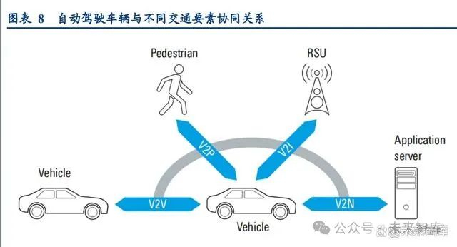 V2X 叠加通信技术,可以满足不同等级自动驾驶车辆需求。车路协同自动驾驶是在单车 智能自动驾驶的基础上,借助 V2X 和通信技术,将“人-车-路-云”交通要素有机地联系 在一起,V2X(vehicle-to-everything)是一种让车辆能够与周围环境中的各种实体进行数 据交换的通信技术,这些实体包括其他车辆(V2V)、行人(V2P)、道路设施(V2I)和 网络(V2N),通过全方位协同配合,从而满足不同等级自动驾驶车辆应用需求(如辅助 驾驶、高等级自动驾驶),实现自动驾驶单车最优化和交通全局最优化发展目标,有效提 高交通效率,改善汽车驾驶感受,从而为用户提供智能、舒适、安全高效的综合服务。