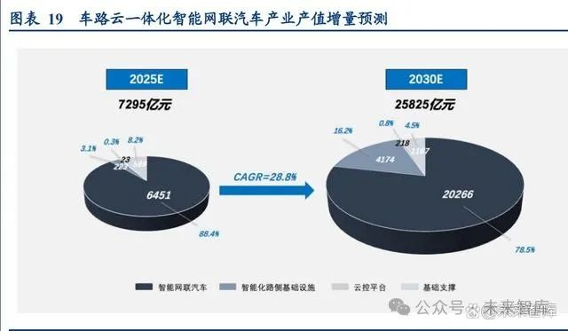 车路协同其意义不仅仅在于加速自动驾驶的普及应用,提高交通安全和交通效率,其对 产业的推动作用也至关重要。VICAD 可以带动智能装备、地图定位、云计算、通信、安 全等相关产业协同发展,在当前以单车智能和车云结合的架构中,安全问题无法得到有 效的解决,而通过 VICAD 可以更加系统化整合跨行业资源,为跨行业融合发展提供动 力。在通信方面,VICAD 是 5G、C-V2X 通信的重要应用场景,将加速通信技术演进和 产业发展。我国在 5G、C-V2X 等先进通信技术领域已经从跟跑走到了领跑地位,确立了 在标准和专利方面的全球领先优势,目前亟需一个体量充分、市场前景广阔的应用场景, 支撑通信行业加速迭代创新。另一方面,万物互联的物联网时代已经不可阻挡,以人工 智能为核心驱动力的自动驾驶技术也逐渐成为交通行业最大的变革因素,智能交通体系 即将迎来以自动驾驶为核心驱动技术的“智能交通物联网”时代。根据中国汽车工程学 会分别对智能网联汽车、智能化路侧基础设施、云控平台和基础支撑四大领域的产值增 量进行测算,在中性预期情景下,预计 2025 年/2030 年我国车路云一体化智能网联汽车 产业总产值增量分别为 7295 亿元/25825 亿元,年均复合增长率为 28.8%。