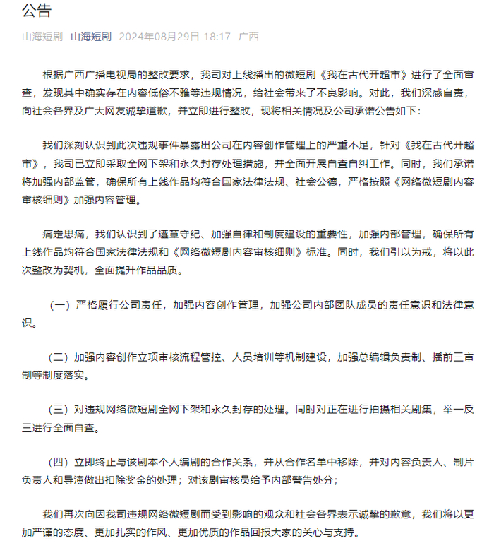针对《我在古代开超市》,该公司立即采取全网下架和永久封存处理措施,并全面开展自查自纠工作。同时,该公司承诺将加强内部监管,确保所有上线作品均符合国家法律法规、社会公德,严格按照《网络微短剧内容审核细则》加强内容管理。