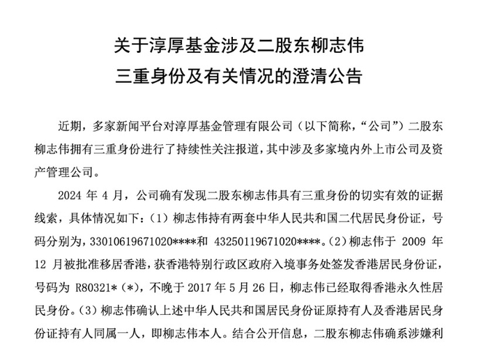 其次,二股东柳志伟被指或涉嫌多重违法违规行为。淳厚基金表示,确有发现二股东柳志伟具有三重身份的切实有效证据线索,包括柳志伟持有两套中华人民共和国二代居民身份证,且不晚于2017年5月26日,柳志伟已经取得香港永久性居民身份。公司已经就证据线索及有关情况整理后正式向监管机构提交了相关报告,待监管机构进一步查证核实及出具处理意见。自发现柳志伟三重身份对公司造成的影响以来,淳厚基金立即切实做好了与该名股东及其关联人员的风险隔离切割措施。