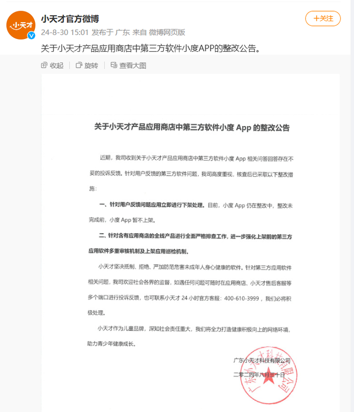 事件被曝光后,今日广东小天才科技有限公司发布整改公告称,相关回答来自第三方App小度,目前已下架该应用,整改完成前将暂不上架;公司针对含有应用商店的全线产品进行全面严格排查工作,进一步强化上架前的第三方应用软件多重审核机制及上架应用巡检机制。