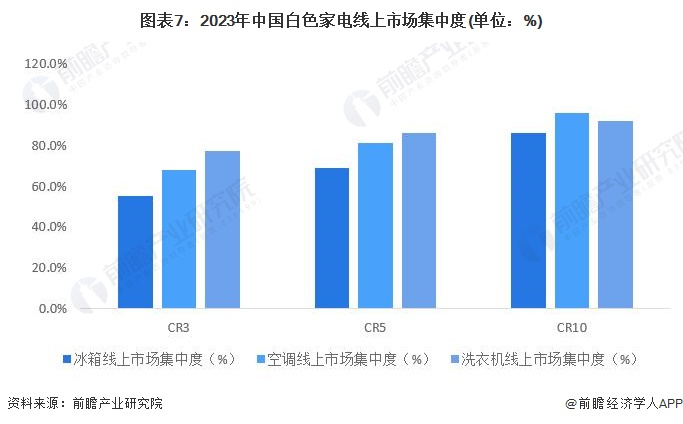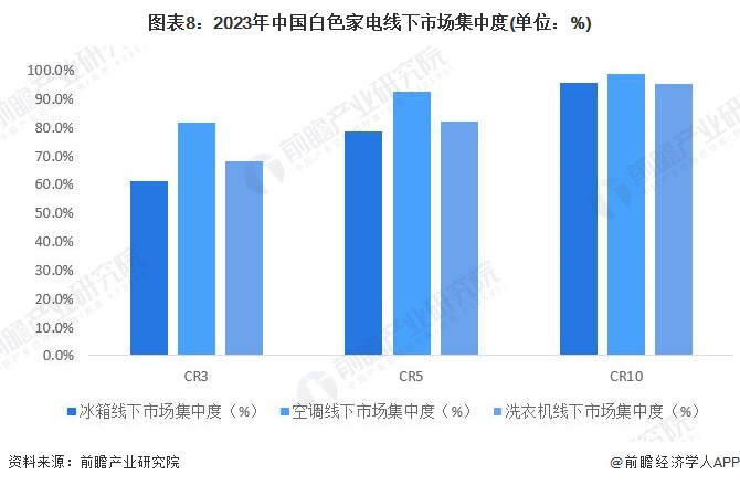 从中国白色家电线下市场集中度来看,2023年,中国白色家电线下市场集中度同样极高。其中,冰箱线下CR3为61.3%;空调线下CR3为81.8%;洗衣机线下CR3为68.2%。