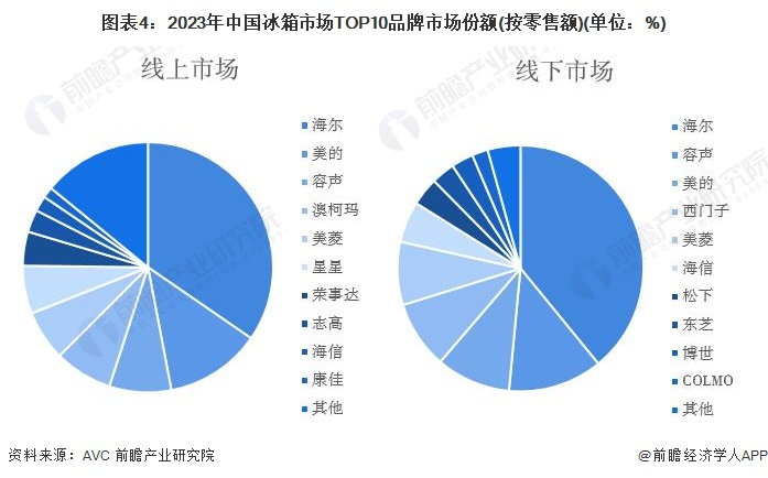 从中国冰箱线上市场TOP10品牌市场份额来看,2023年,海尔线上零售额占比最高,达到了34.6%;其次为美的,占比为12.4%;随后为容声,占比为8.0%。从中国冰箱线下市场TOP10品牌市场份额来看,2023年,海尔在中国冰箱线下市场中零售额占比最大,达到了39.1%;其次为容声,市场份额占比为12.4%;随后为美的,市场份额占比为9.8%。