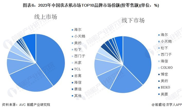 从中国洗衣机线上市场TOP10品牌市场份额来看,2023年,海尔洗衣机线上零售额占比最高,达到了39.8%;其次为小天鹅,占比为28.5%;再次为美的,占比为9.1%。从中国洗衣机线下市场TOP10品牌市场份额来看,2023年,海尔在中国洗衣机线下市场中零售额占比最大,达到了37.7%;其次为小天鹅,市场份额占比为20.0%;再次为松下,市场份额占比为10.5%。