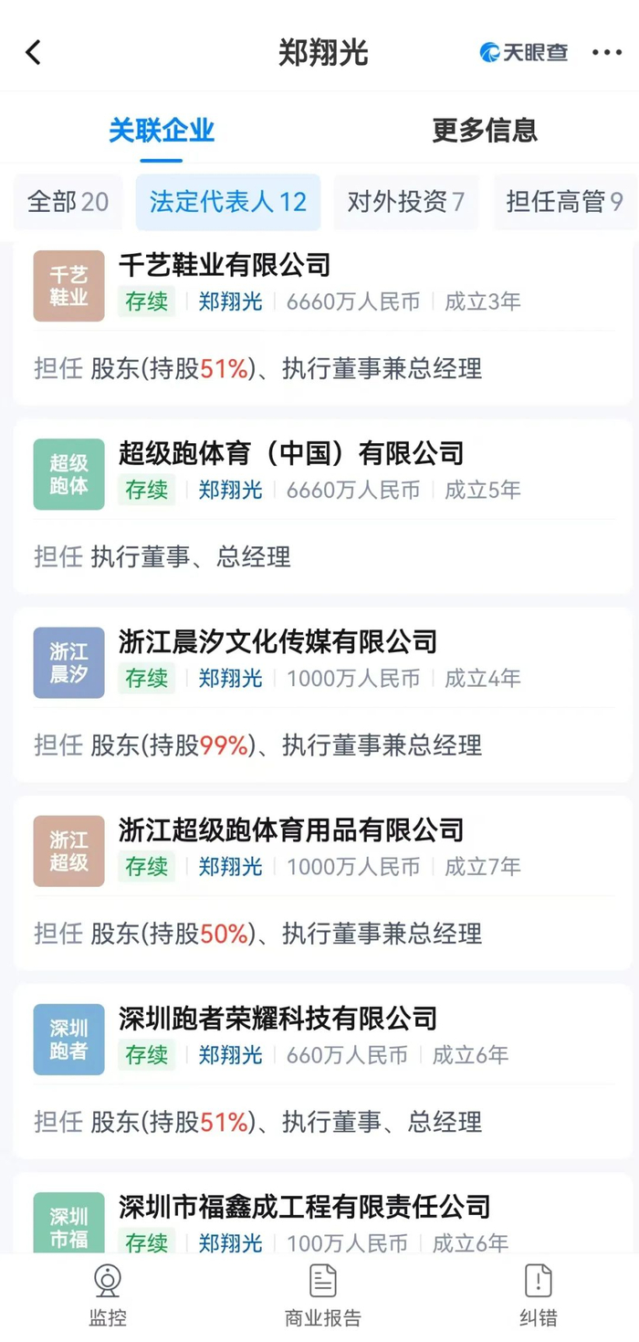 他们夫妻俩,还共同持股多家公司。比如千艺鞋业、超级跑体育、跑者荣耀科技等。